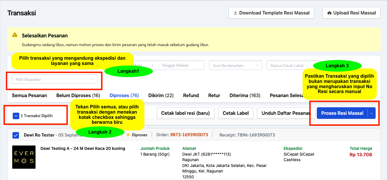 Berikut panduan yang dapat Anda ikuti dalam memproses resi secara massal: