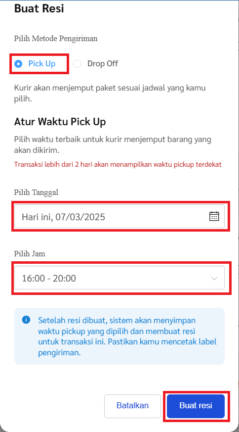 4. Akan muncul pop up form Buat Resi. Pilih layanan Pick up, Pilih Tanggal pick up, dan Pilih Waktu pick up. Setelah itu klik button Buat Resi