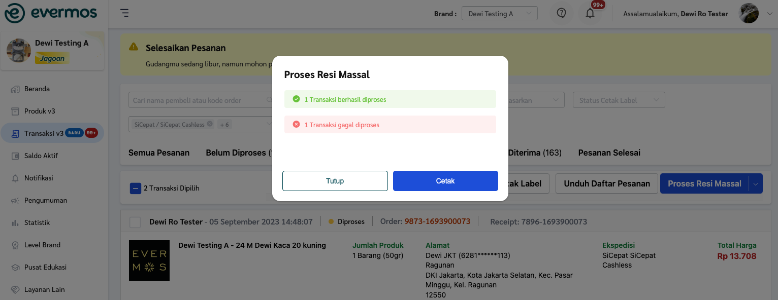 Fitur proses resi secara massal hanya dapat Anda lakukan pada pesanan-pesanan yang menggunakan resi otomatis dengan pilihan jasa kirim sesuai list Apa saja jasa kirim yang tersedia di Evermos?. JIka Anda ingin memproses massal untuk resi manual, Anda dapat mengikuti langkah pada Panduan Upload Resi Manual secara Massal
