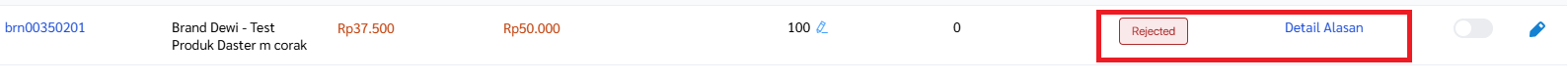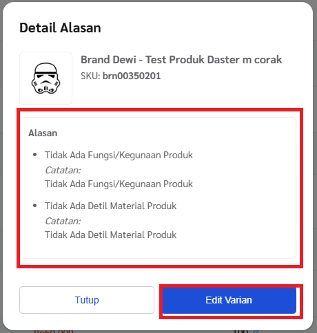 4. Akan muncul pop up halaman terkait detail alasan penolakan produknya. Untuk melakukan perbaikan, klik Edit Varian