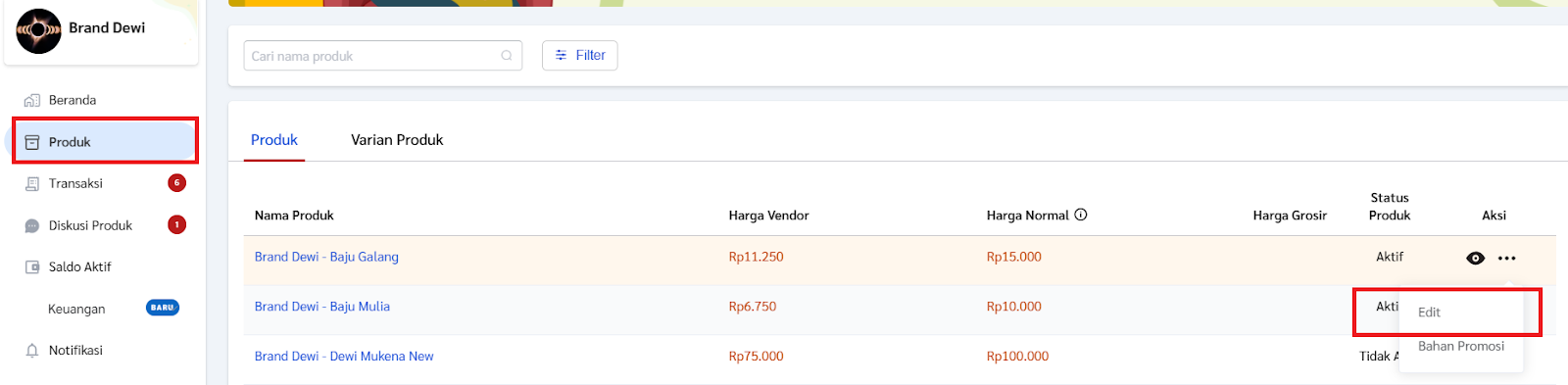 Untuk produk yang statusnya sudah aktif, maka Anda dapat menggunakan fitur Edit Produk di Brand Dashboard.